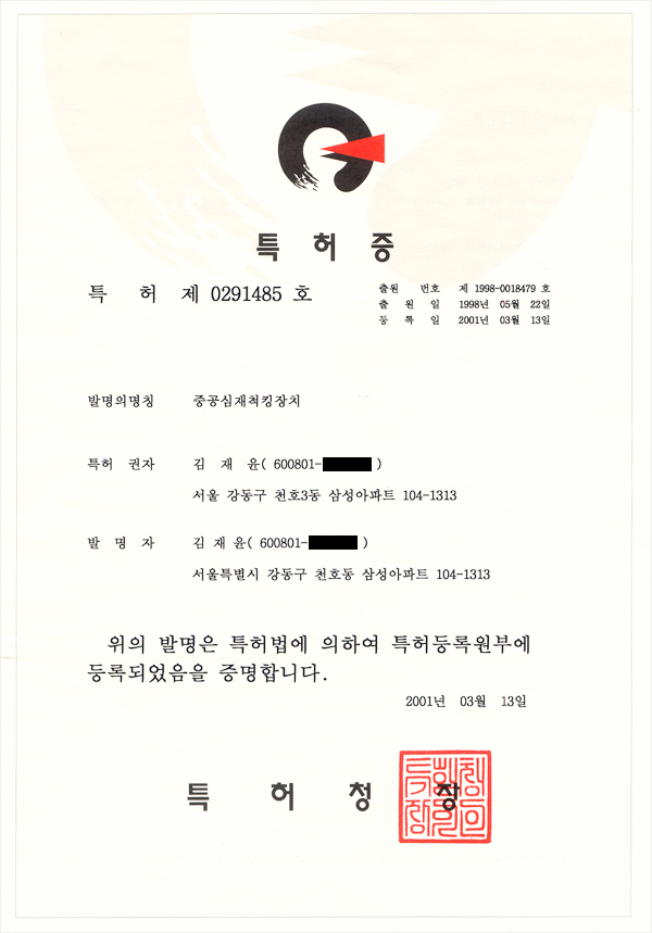 | Patent Registration | Rechucking Equipment for Hollow Core | 2001.03.13 |